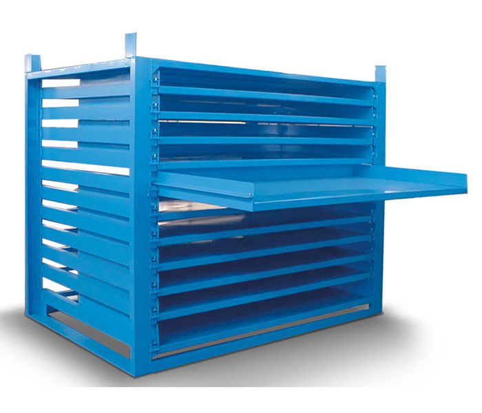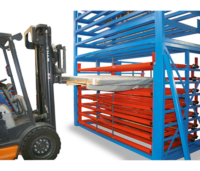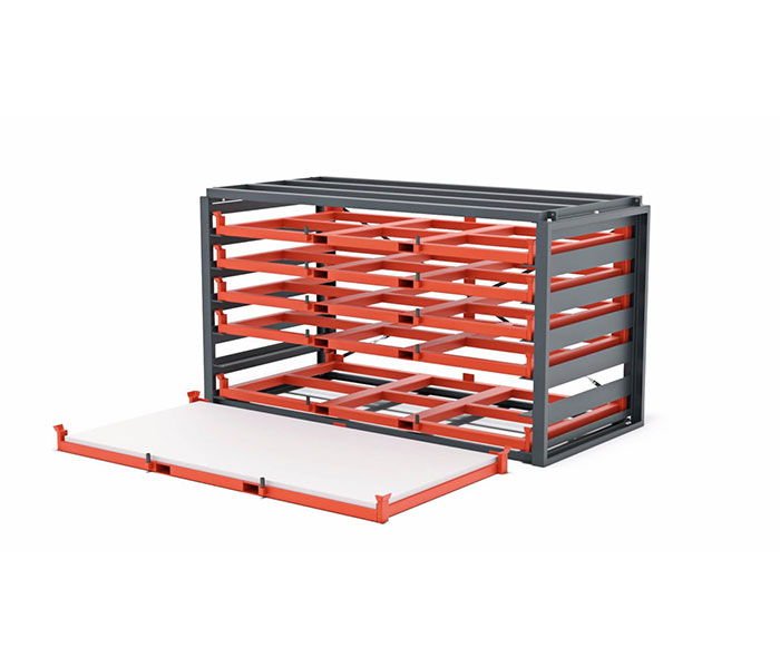 Unorganized storage of metal sheets, panels or boards occupies significant space and can create handling risks. Tower racks with 8 shelves and 1 ton capacity per shelf allow vertical and organized storage of materials, maintaining order while reducing the risk of damage.