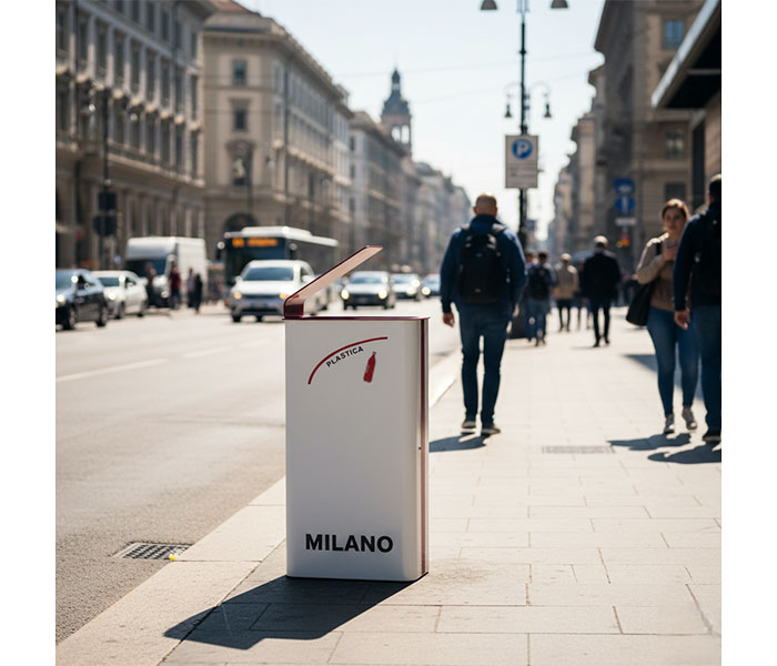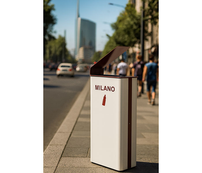 Inside, the bin is equipped with a metal holder for waste bags, ensuring proper positioning and easy replacement. Emptying is done by opening the side panel, which is equipped with a technical key locking system to prevent unauthorized access and vandalism.